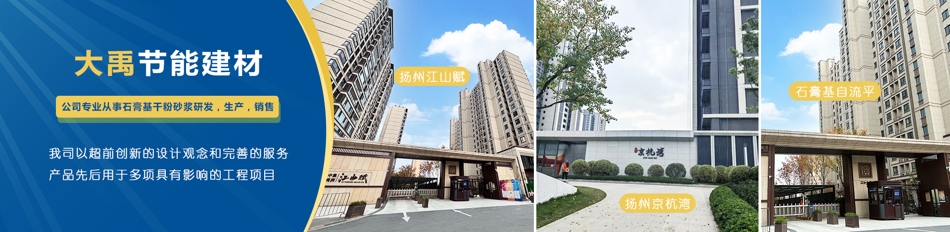 揚(yáng)州市大禹節(jié)能建材科技有限公司成立于2005年9月,位于聯(lián)合國(guó)宜居城市---江蘇省揚(yáng)州市,地處江都經(jīng)濟(jì)開(kāi)發(fā)區(qū),與揚(yáng)、鎮(zhèn)、泰三市接壤,交通十分便捷。公司是專(zhuān)業(yè)從事石膏基干粉砂漿研發(fā),生產(chǎn),銷(xiāo)售一體化的綜合性科技型企業(yè),為國(guó)家標(biāo)準(zhǔn)GB/T2862-2012《抹灰石膏》的參編單位?! 」緭碛袊?guó)內(nèi)一流的特種砂漿生產(chǎn)線(xiàn),并配有各種先進(jìn)的檢測(cè)儀器,年生產(chǎn)能力可達(dá)10萬(wàn)噸。各崗位管理及技術(shù)人員齊備,對(duì)產(chǎn)品···